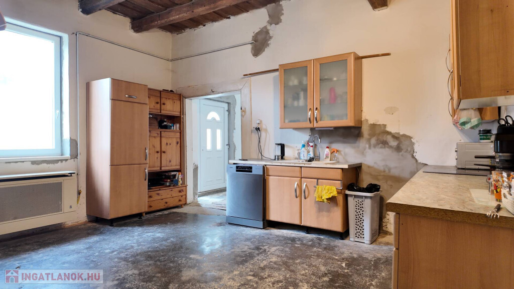 Elosztása: tágas előtér, 2 nagy szoba, nappali kemencével, nagy konyha-étkező, tusolós fürdőszoba, spájz.