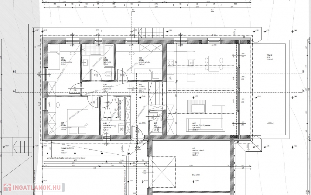 - 1 szintes lakótér: 3 szoba, 1 fürdő, 1 külön WC, valamint tágas, teraszra nyíló nappali, konyha és garázs.