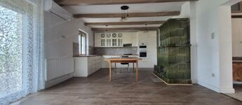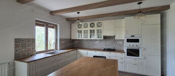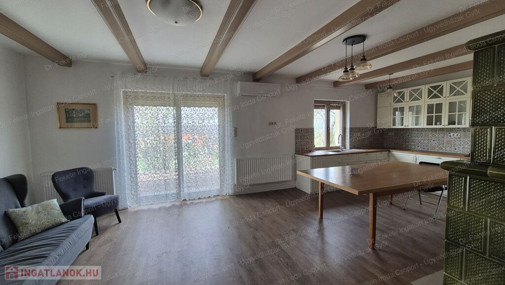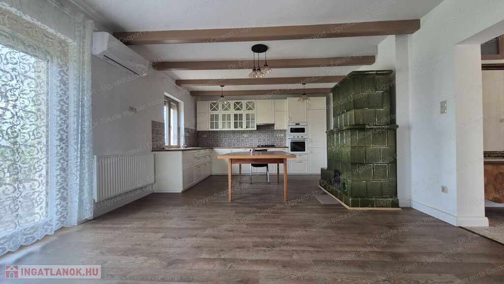 -30 m²-es nappali–konyha–étkező egy légtérben, gyönyörű működő cserépkályhával, modern gépesítéssel, közvetlen teraszkapcsolattal