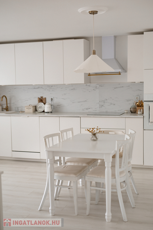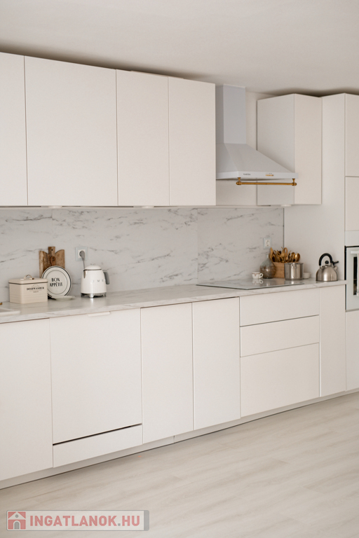 A konyha teljesen gépesített, beépített hűtővel, mosogatógéppel és sütővel, a gardrób berendezése megegyezés tárgyát képezi. A nappaliból és a teraszról egyaránt páratlan, városra néző örökpanoráma tárul elénk