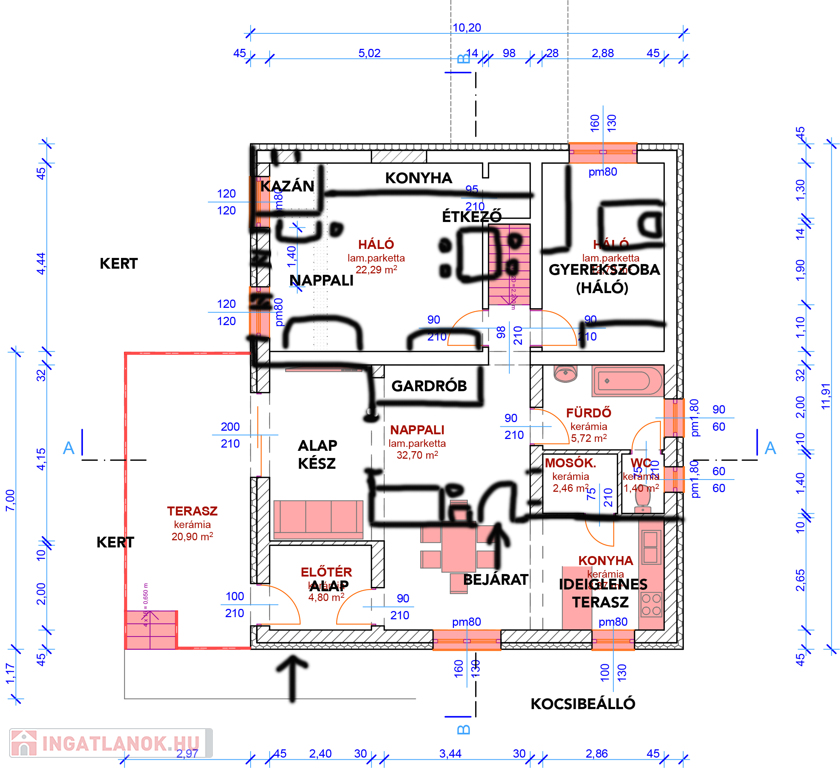 Fűtés: Az otthon melegét modern elektromos kazánnal működő padlófűtés biztosítja, a nappali és a gyerekszoba pedig hővisszanyerős szellőzőt kapott.