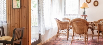 A kettő szintes épület alsó és felső szintjén is barátságos terasz fogad.