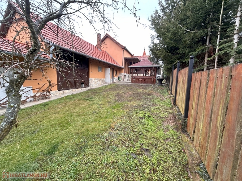 A ház utcafrontját igényes kovácsoltvas kerítés szegélyezi, az udvarban pedig térkő burkolat biztosítja a rendezett megjelenést. Az ingatlanhoz több melléképület és garázs is tartozik, valamint egy pince, ahol közösségi helyiség és nyári konyha is kialakításra került. A kertben fedett kerti grillterasz található, amely tökéletes helyszínt biztosít baráti és családi összejövetelekhez.