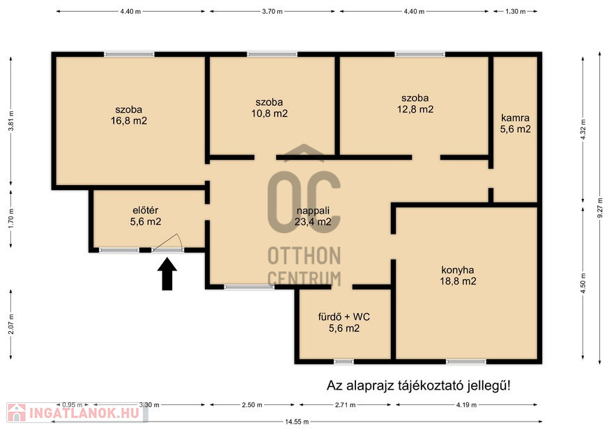 - Helyiségek: előtér, 3 szoba, nappali, konyha-étkező, kamra, fürdő-WC.