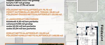 A földszint és az emelet nettó alapterülete így 148,58 nm, ebből a hasznos lakótér 109 nm.