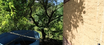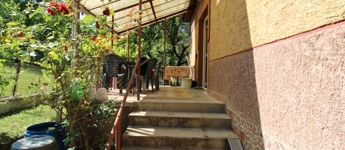 A kert sík, élhető kialakítású, szőlő lugassal, gyümölcsfákkal, vidám kis virágokkal. Telekméret: 855 nm.