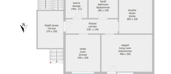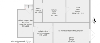 A felső lakószinten 2 szoba, nagy konyha-étkező, erkély, fürdő és előszoba, spájz található. Lenn pince, terasz, garázs, műhely.