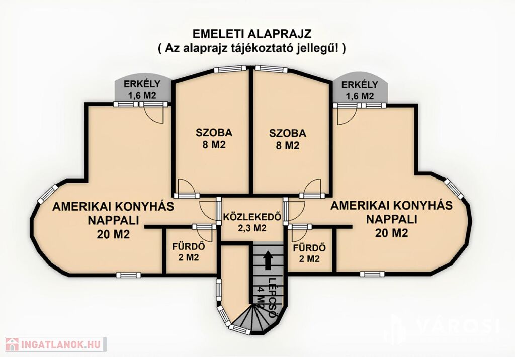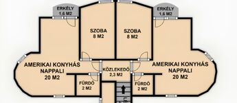 - Felső szint: 2 db 40 m2-es, külön bejáratú apartman, mindkettőben nappali-étkező-konyha, 1 hálószoba és fürdőszoba WC-vel.
