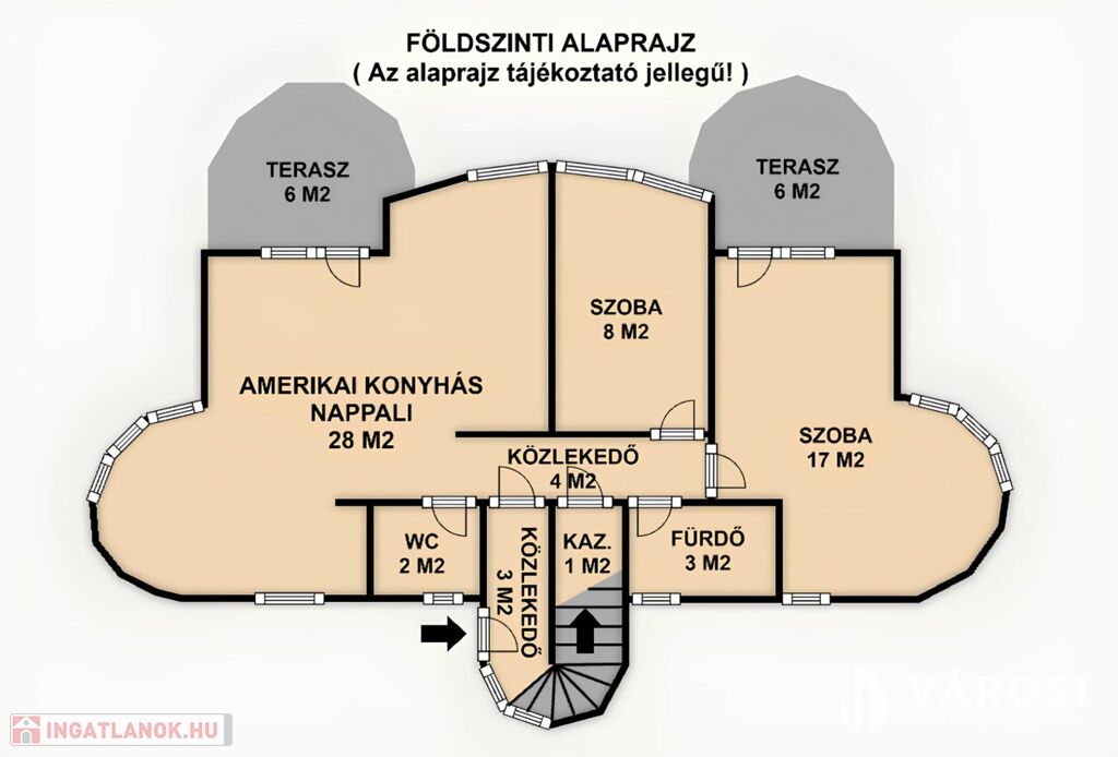 - Alsó szint: 80 m2-es lakás, amely nappali-étkező-konyhából, 2 hálószobából, fürdőszobából és külön WC-ből áll.