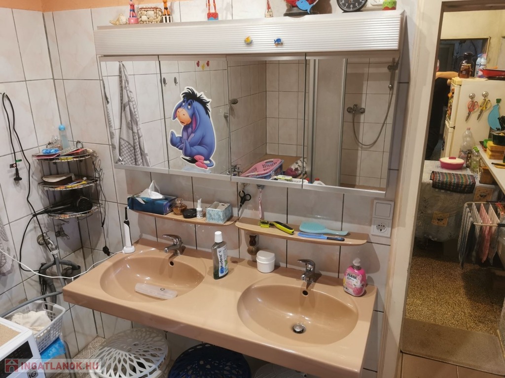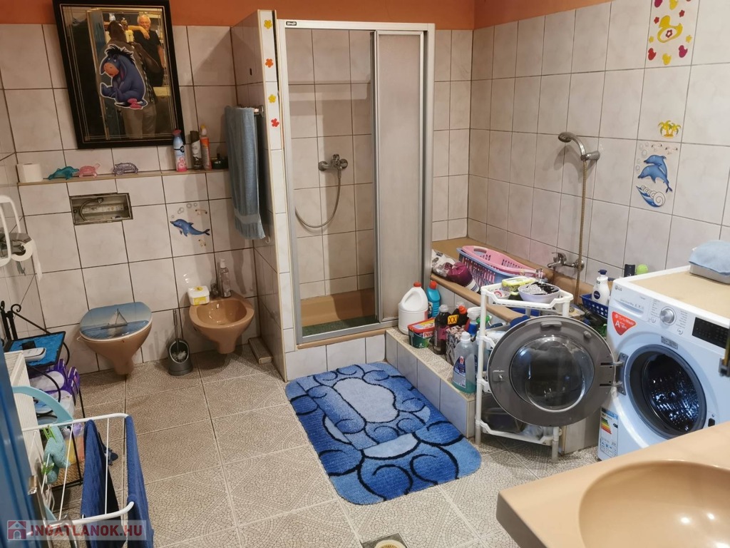 A fürdőben dupla mosdó, zuhany kabin, kád és bide is található.