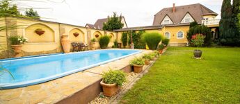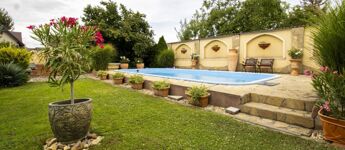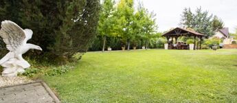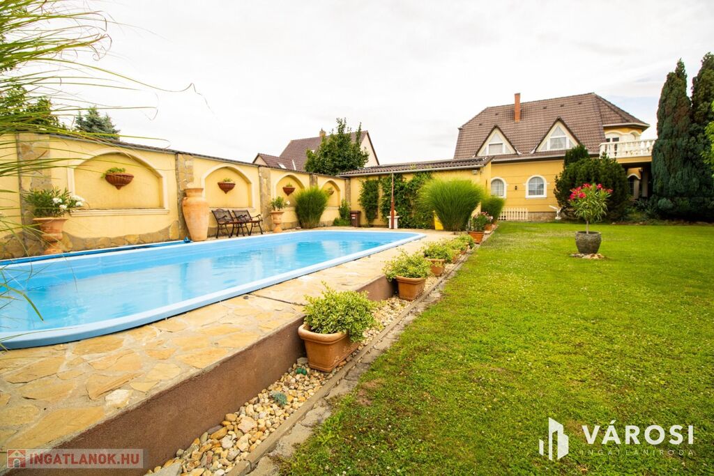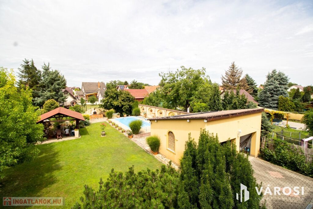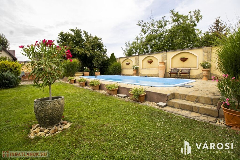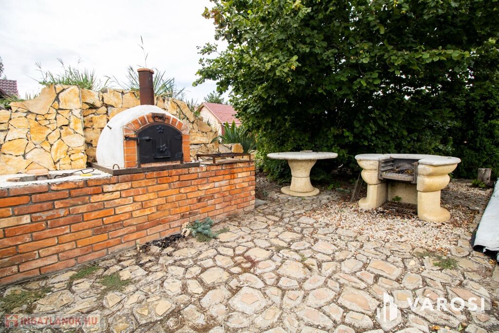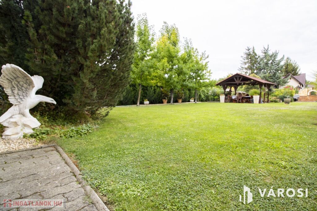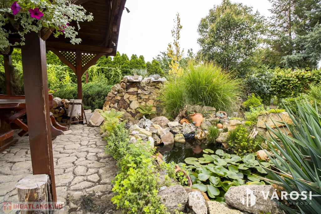 A kert maga a kikapcsolódás szigete: profin parkosított első és hátsó kert, 8*4 m-es úszómedence vízforgatóval, tisztítóval, pihenő-, napozóterasszal, hangulatos 20 m²-es kerti pavilon, grillező, kemence, halastó csobogókkal és két fúrt kút is helyet kapott.