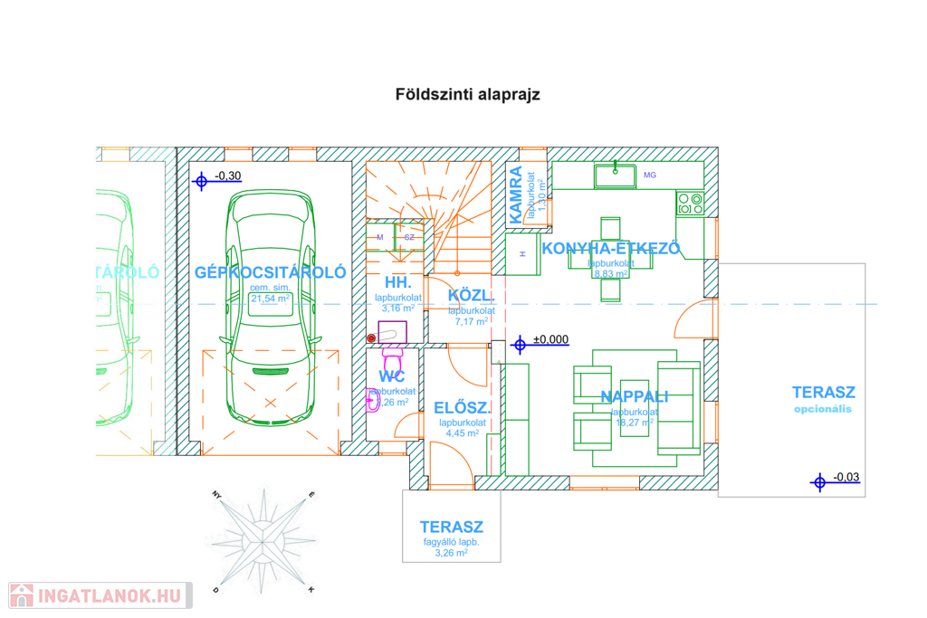 A bruttó 129 négyzetméterbe a következők fértek bele. A földszinten hatalmas amerikai konyhás nappali spájzzal, háztartási helyiség, wc, garázs. A közlekedőből vezet az impozáns lépcső a felső szinthez, ahol 3 tágas hálószoba, egy nagy fürdőszoba és gardróbszoba várja a beköltözőket. Nagy családnak több gyerekkel ideális választás.