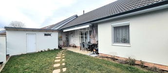 A kertben önálló 7 nm-es tárolóház épült, a 17 nm-es terasz motoros napellenzővel árnyékolható.