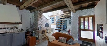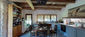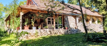 Alapozása betonalap, falai 55 cm-es kőfalak, dupla hőszigetelt fa nyílászárókkal, természetre tekintő nagy üvegfelületekkel a földszinten, ahol egy tágas, amerikai konyhás nappali-étkező, fürdőszoba és hálószoba került kialakításra. Két bejárata van a háznak, az utca felől egy 12,5 m2-es tornácos, fedett terasz, a patak felől egy félig fedett 30 m2-es hátsó terasz került kialakításra.