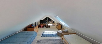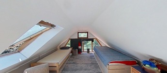 A tetőtér további egy 32,5 m2-es hálószobát foglal magába, mely egy légtér jelenleg, de igény szerint ketté osztható. A szinteket egyedi kézműves rönkfa lépcső köti össze.