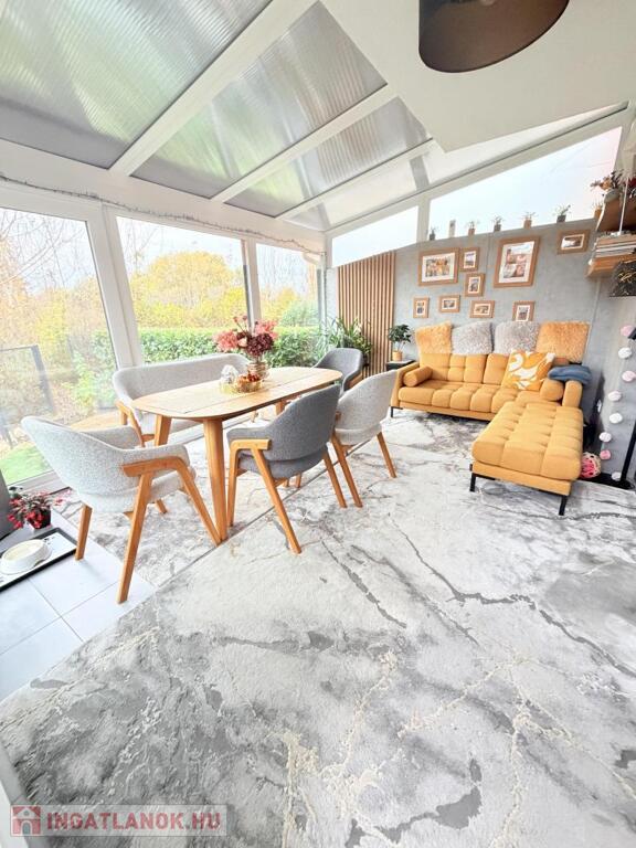 Amint belépsz, az otthon melege és az ízléses enteriőr azonnal magával ragad. A világos, tágas nappali a kerttel és a hangulatos, üvegezett télikerttel nyílik egybe – innen rálátsz a parkosított kertre és a zöldre, ahol gyakran őzek néznek be a kerítésen.