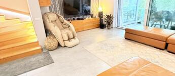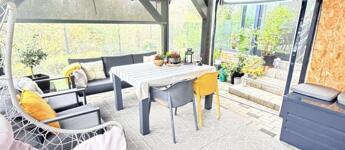 Az utólag kialakított télikert elektromos padlófűtéssel és hűtő-fűtő klímával egész évben tökéletes pihenőhely – akár egy jó kávé mellé reggel, akár egy pohár bor mellé este.