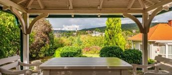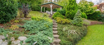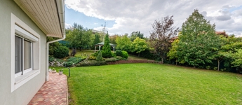 Az 1203 m²-es, sík telek ritka adottságú a környéken. A gondosan tervezett kert gyümölcsfáival, dísznövényeivel és panorámás szaletlivel a pihenés és kikapcsolódás tökéletes helyszíne. A nappaliból nyíló, hatvan négyzetméteres terasz a ház természetes meghosszabbítása, amely ideális helyszínt biztosít családi étkezésekhez vagy nyári estékhez.
