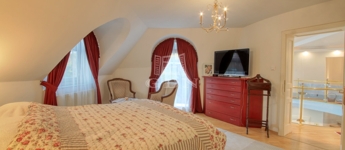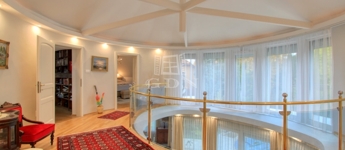 Az emeleti szinten a kör alakú galéria térből juthatunk egy 15 m2-es gardrób szobán keresztül 2 db hálószoba felé (ahol az egyik hálószobához erkély kapcsolat és zuhanyzós fürdőszoba tartozik), illetve a fő hálószoba és dolgozószoba irányába. A fő hálószobából tágas, walk-in zuhanyzóval, pezsgőfürdős káddal rendelkező fürdőszoba nyílik.