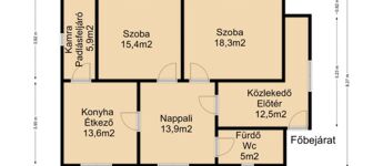 Belső lakrész helységei: konyha-étkező közvetlen kamrakapcsolattal, 2 külön bejáratú szoba, nappali, fürdő mellékhelységgel együtt, előszoba közlekedő.