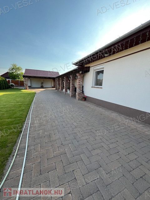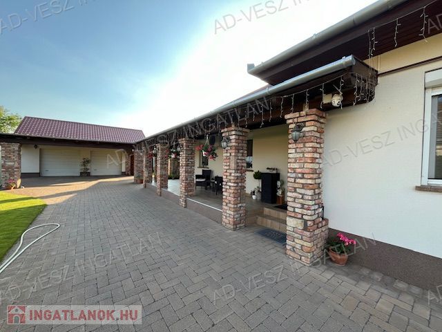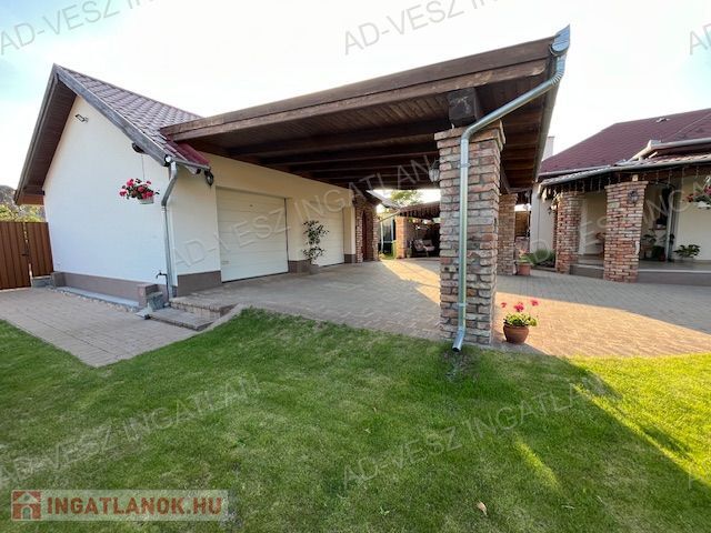 -Garázs előtt 6x6 méteres féltetős, viakoloros autóbeálló.