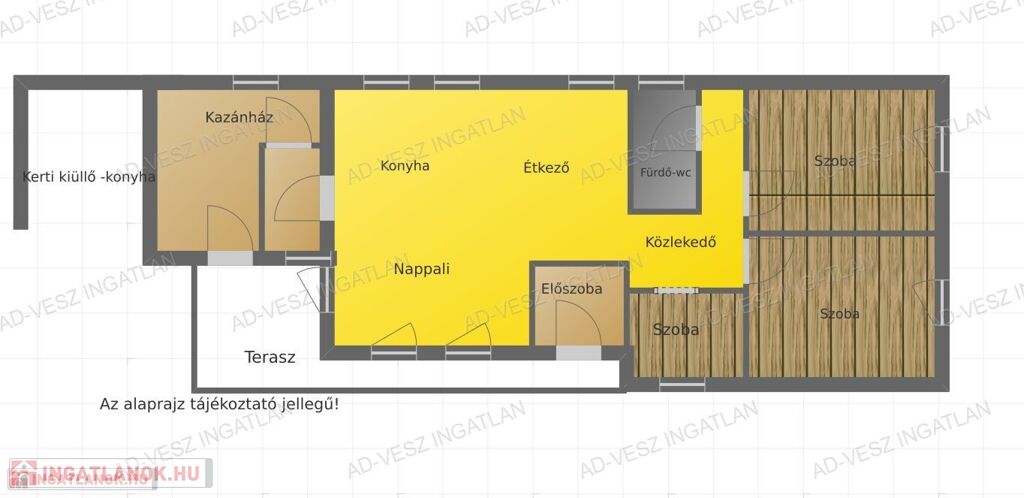 -3 szoba, 49m2-es amerikai konyhás nappali és étkező, fürdőszoba, wc, kazánház, kamra.