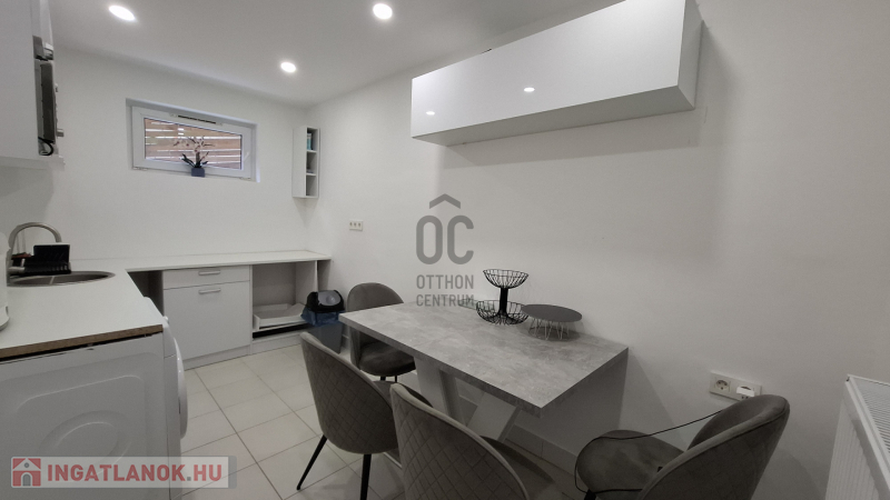 A kertnek a szintjén helyezkedik el a két szobás kisebbik lakás, amely tökéletes választás szülőknek, nagy gyerekeknek, vállalkozásnak vagy akár Wellness résznek. Itt két szoba , egy étkezős konyha valamint a fürdőszoba kapott helyet. Mögötte a telek lejtése miatt egy szép nagy száraz, ablakos pince kapott helyet.