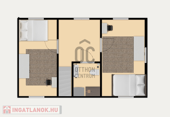 Az utcafront felől két szinten helyezkedik el a másik lakás. Az alsó szinten a tágas amerikai konyhás nappali világos és barátságos légkört teremt, ahol a családi összejövetelek és baráti találkozók felejthetetlen élményei valósulhatnak meg. Itt található még egy hálószoba , valamint a nagy méretű sarokkádas fürdő is. Az emeleten a kisebb nappaliból két szoba és egy fürdőszoba nyílik.