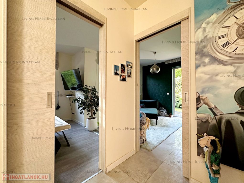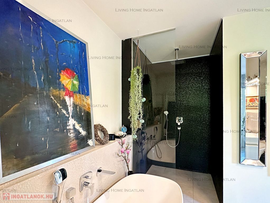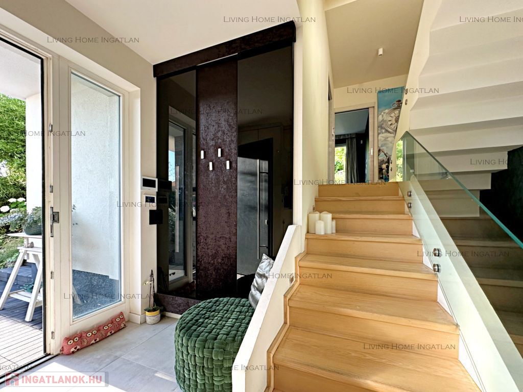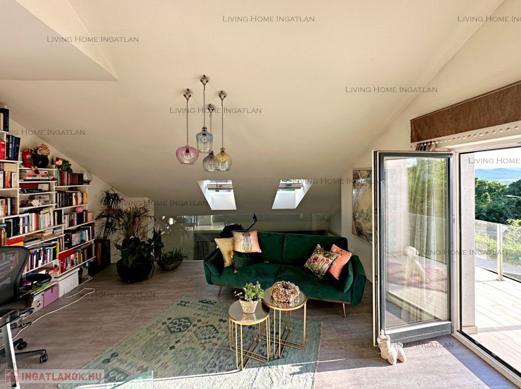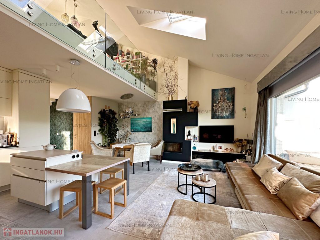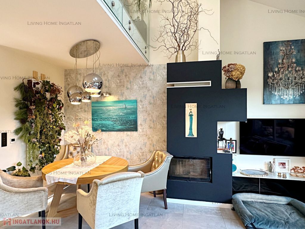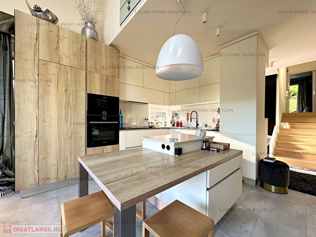 A különleges építészeti megoldásokkal kialakított terek és a szinteltolás tágassá, élhetővé teszik az ingatlant. A galériáról egyaránt gyönyörű a panoráma nyílik a környező hegyekre és a belső terekre is. Minőségi burkolatok, egyedi nyílászárók, egységes dizájn és harmonikus színek jellemzik az egész házat.