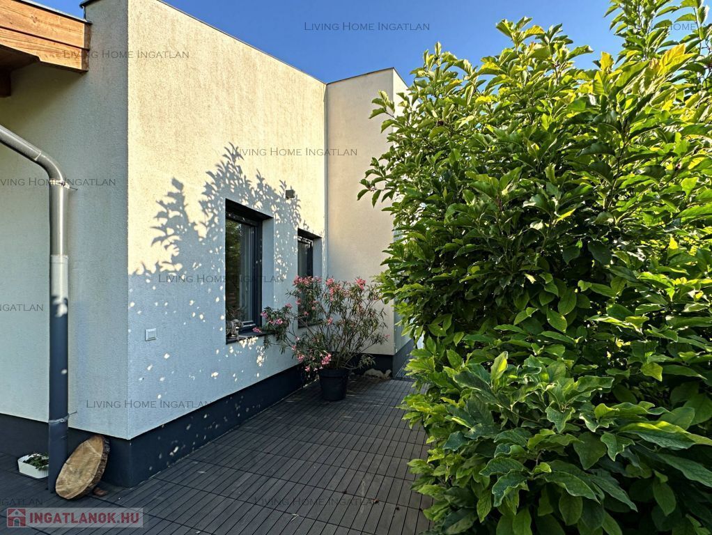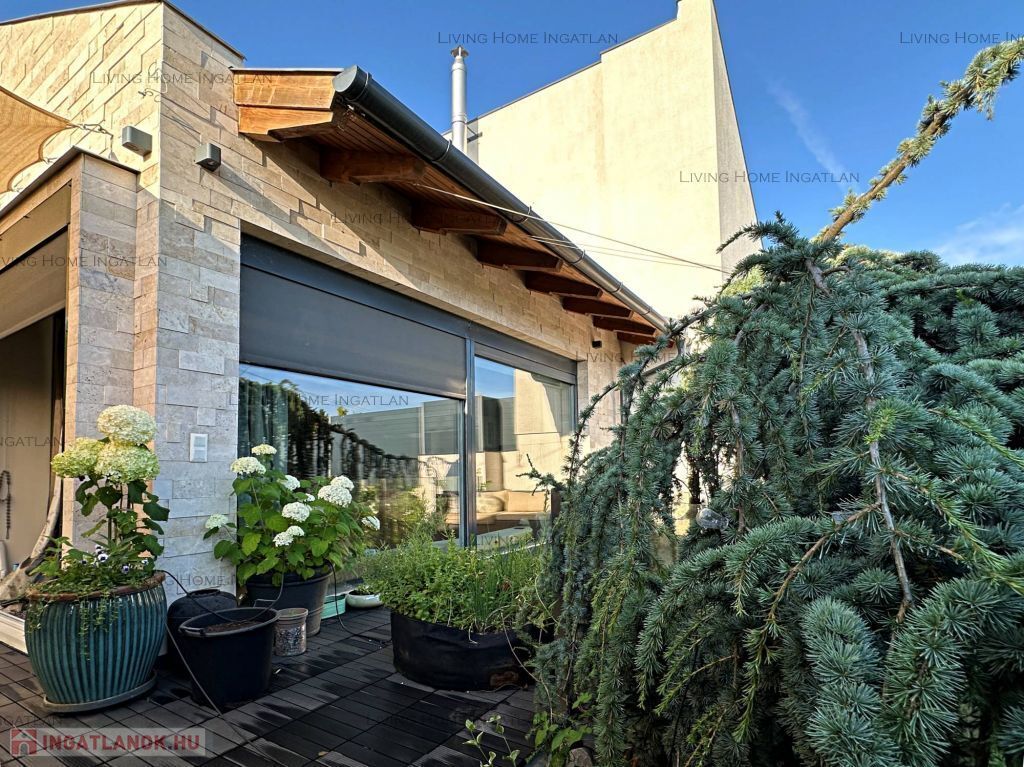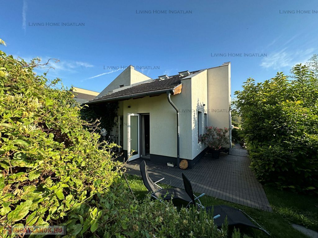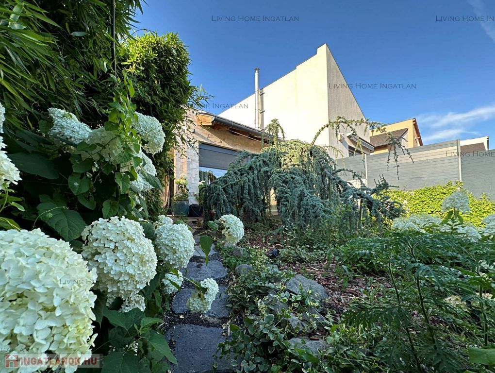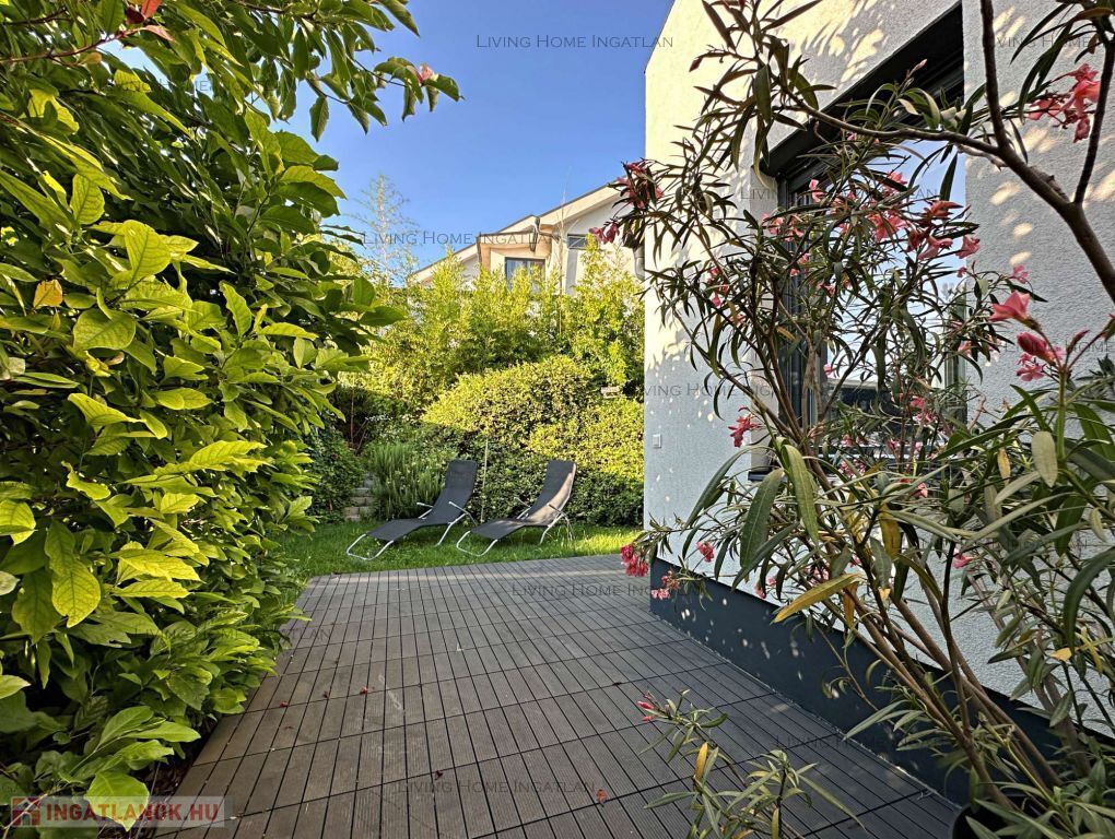 For sale a modern semi-detached house at the meeting point of the Pilis and the Buda Hills, in Üröm, on Rókahegy. The 440 sqm intimate garden with Mediterranean and other ornamental plants, rock garden, relaxing corner and large terrace complete the tranquility and recharging of this home.