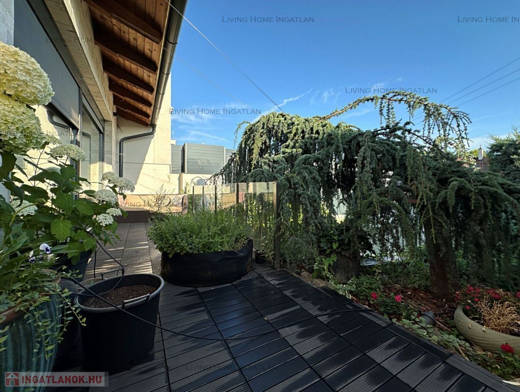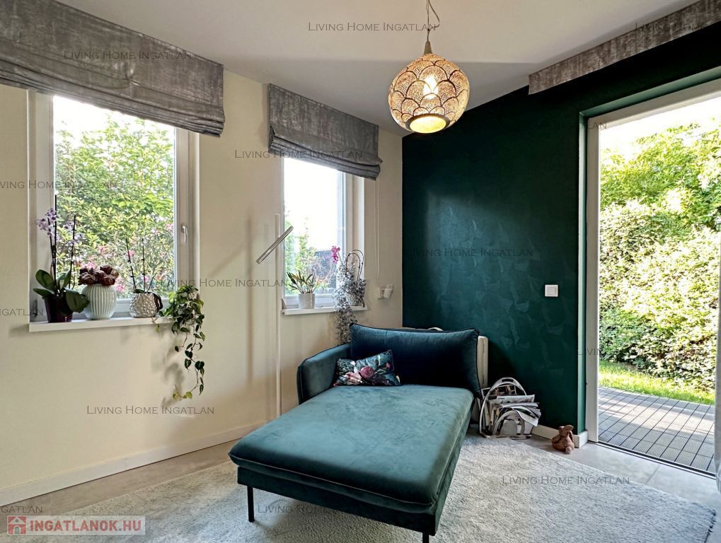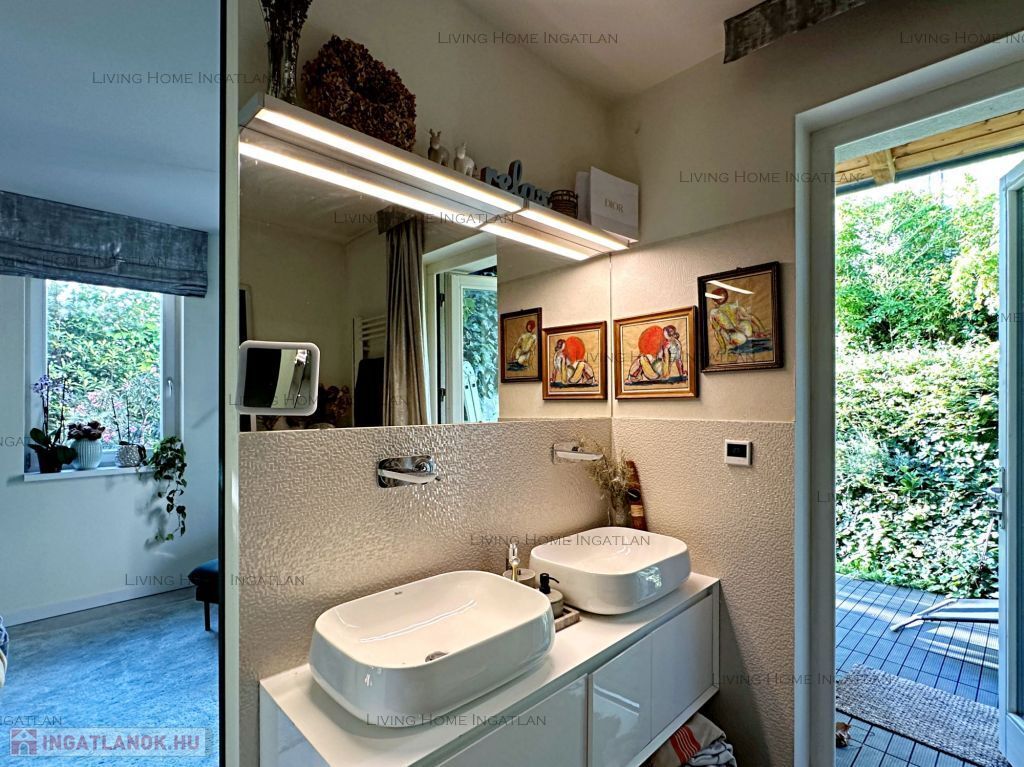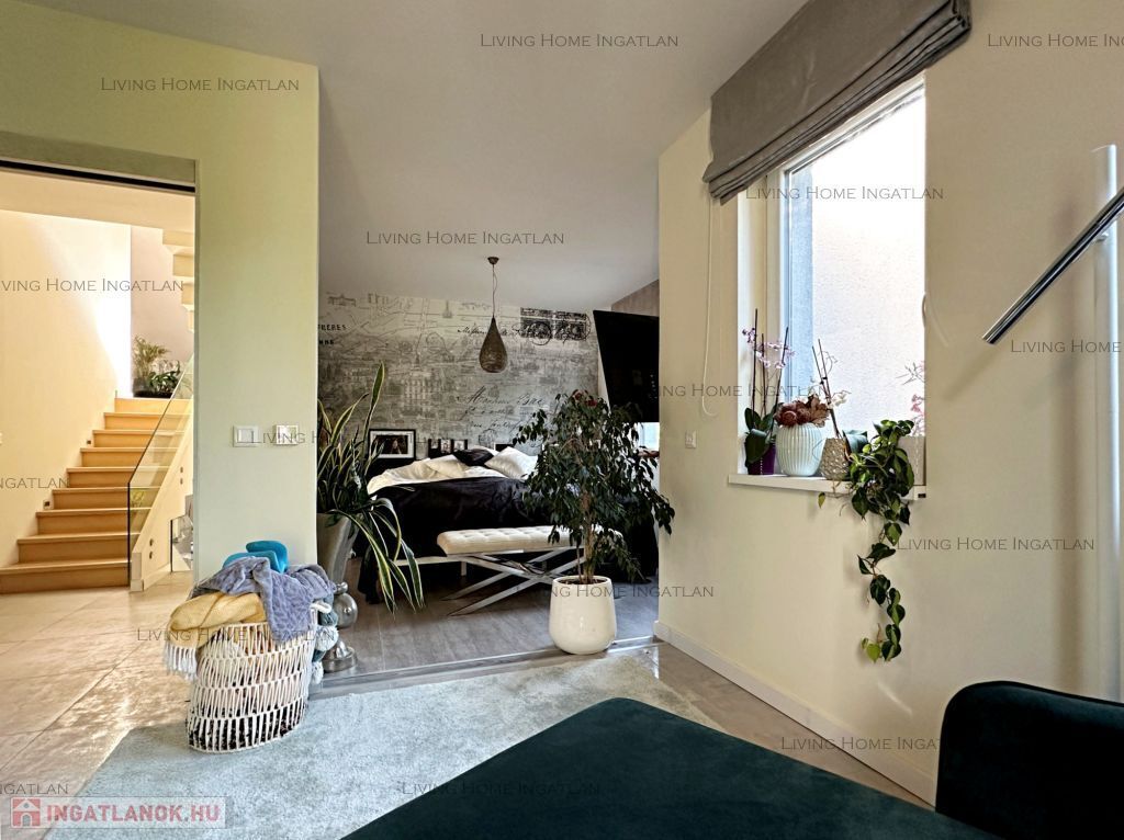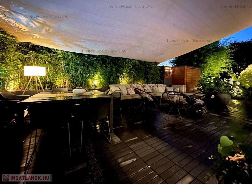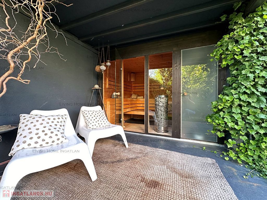 For sale a modern semi-detached house at the meeting point of the Pilis and the Buda Hills, in Üröm, on Rókahegy. The 440 sqm intimate garden with Mediterranean and other ornamental plants, rock garden, relaxing corner and large terrace complete the tranquility and recharging of this home.