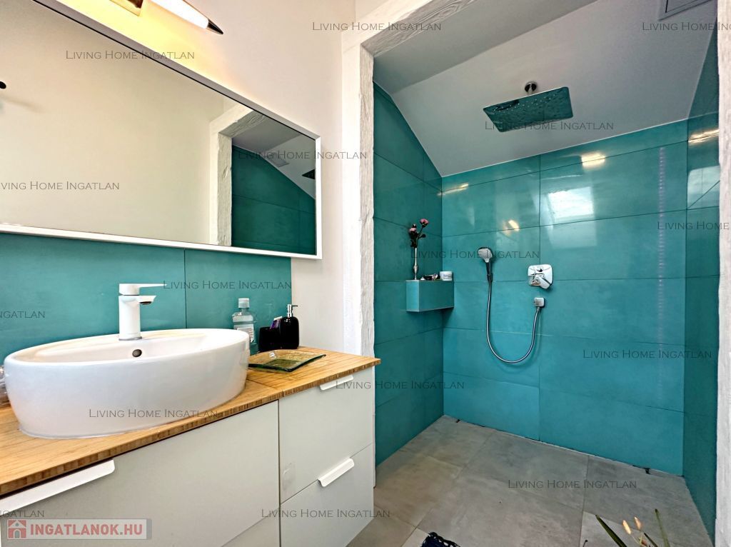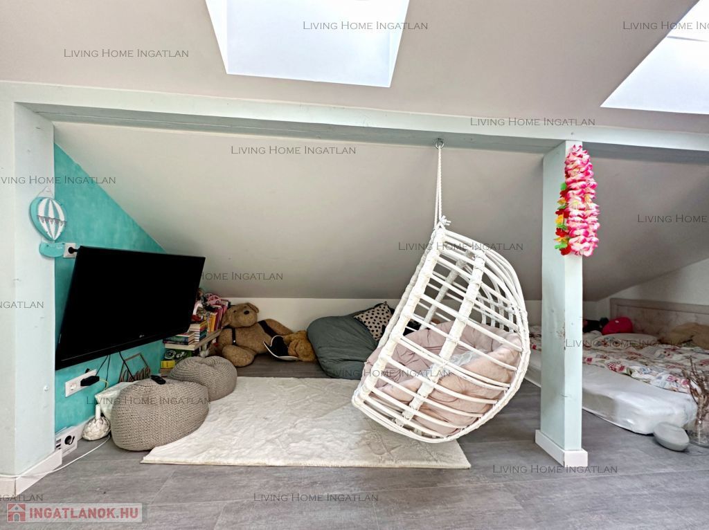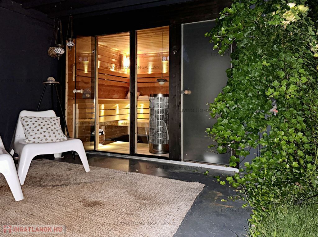 Félemelet: Néhány lépcsőfokkal juthatunk a félemeletre, ahol két háló található, melyek jelenleg egybenyitottak. A fürdőben kétszemélyes walk-in zuhanyzó, szabadonálló kád, két mosdó található. A hátsó teraszra a hálóból és a fürdőből is kiléphetünk. A kerti szauna és a merülő medence teszik teljessé a wellness hangulatot.