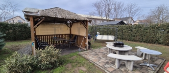 A telek hátsó, füves részén egy fedett, beülős kis faház és egy kőből épített sütögető szolgálja a családi és baráti összejöveteleket – egy valódi, meghitt kertkapcsolatos élettér, ahol a hétköznapok is ünneppé válhatnak.