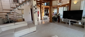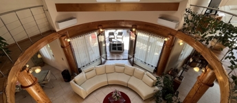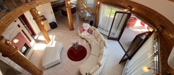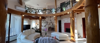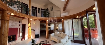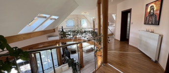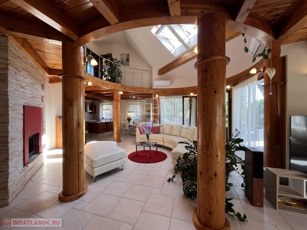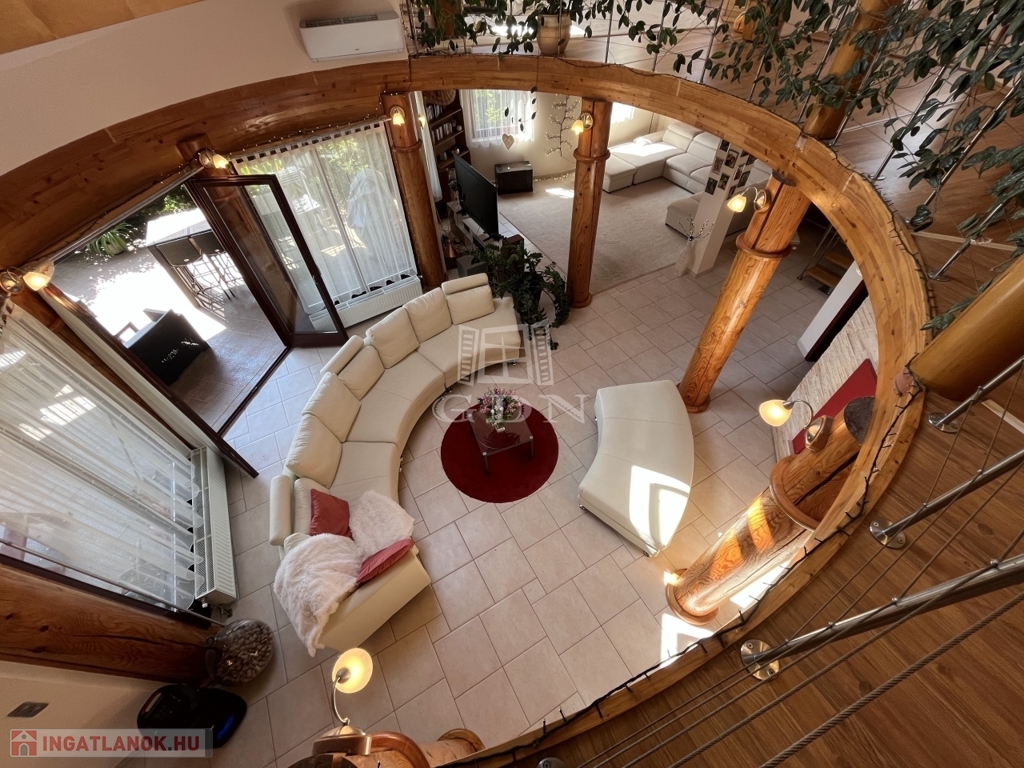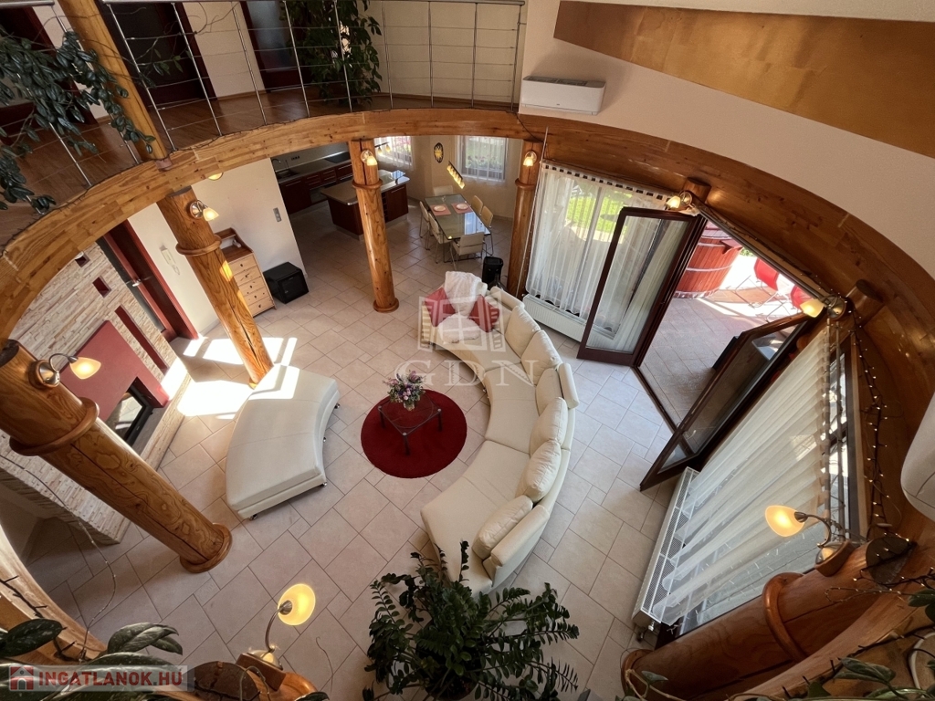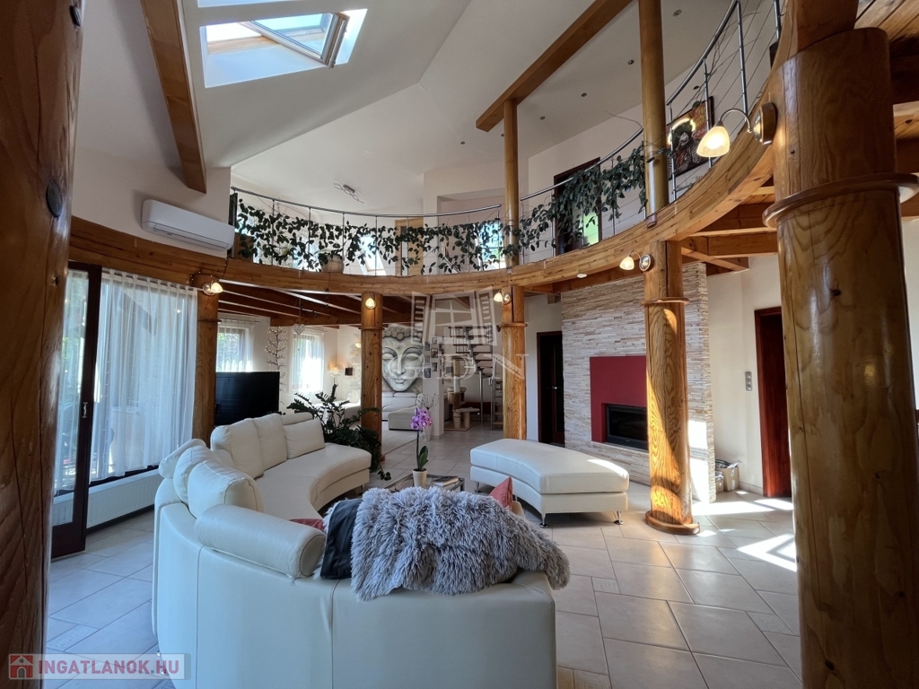 • 6 méteres belmagasságú, különleges kivitelezésű, galériás nappali, kandallóval