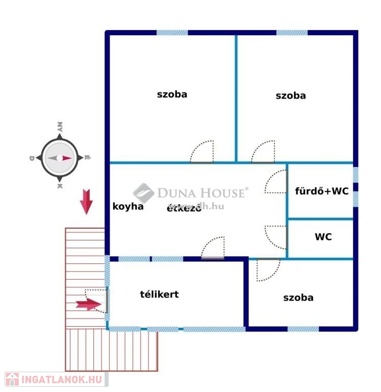 A teraszt hatalmas üvegportállal beépítették így a kapott télikerten keresztül jutunk be a tágas konyha-étkezőbe. Ebből a helyiségből nyílnak a szobák, a fürdőszoba és a mellékhelyiség is.