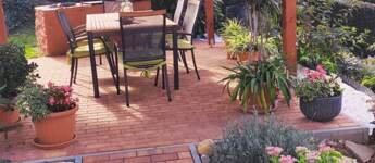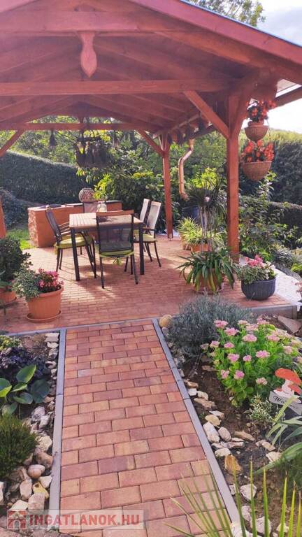 A 1 200 m²-es parkosított telek dísznövényekkel, virágokkal beültetett.