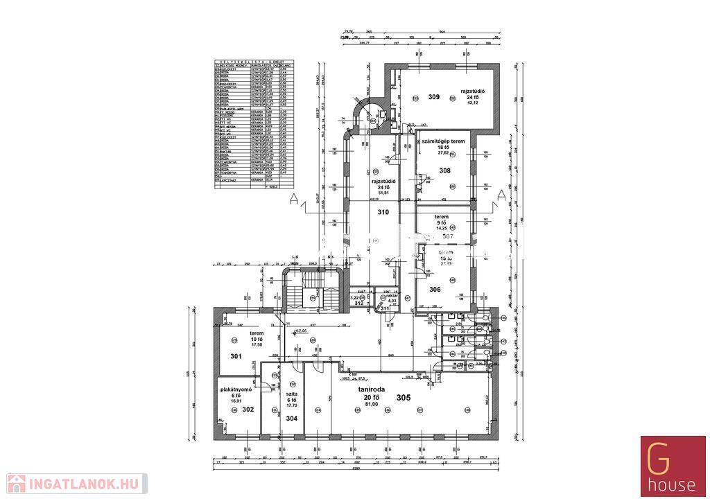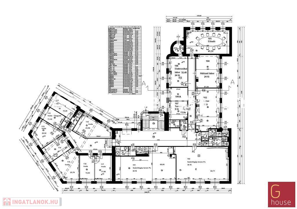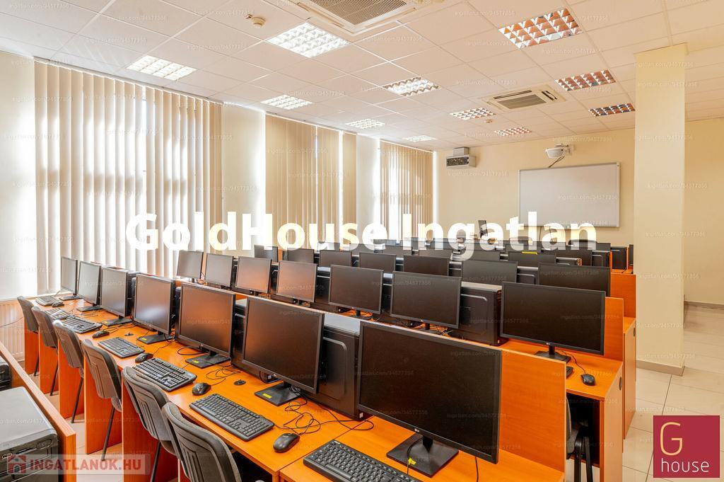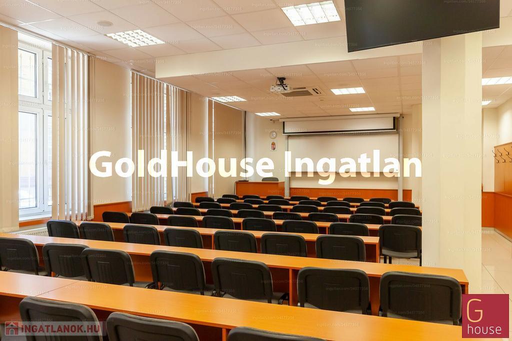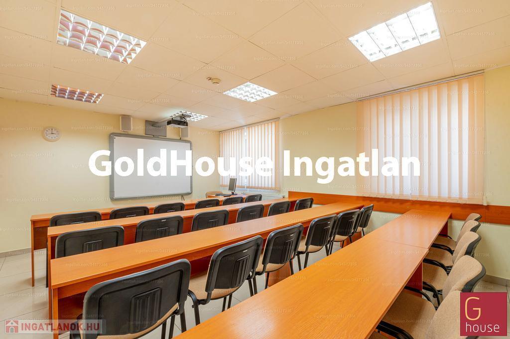 Földszint 848 nm: aula/recepció, 9 kisebb-nagyobb terem/iroda 8-56 fős+ 90 fős előadóterem, mosdók, büfé, teakonyhák, tornaterem zuhanyzós öltözőkkel.