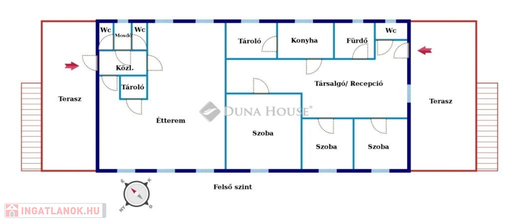 Az épület 2 szintes kialakítású. Alsó szintjén 6 nagyobb méretű szoba (mindegyik szoba saját fürdő+wc-vel rendelkezik), konyha, raktárak, és további zuhanyzók találhatóak. A szinten a helyiségek funkciójának optimalizálásával további 2 kiadható szoba kialakítható. Felső szintjén egy 3 szobás apartman, továbbá egy nagy méretű étkező, és hozzá tartozó konyha találhatóak, mely közösségi térként, de akár büféként, étteremként is hasznosítható. Az épülethez egy műhelynek, tárolónak is alkalmas garázs csatlakozik (mérete nincs benne a megadott 320m2-ben).