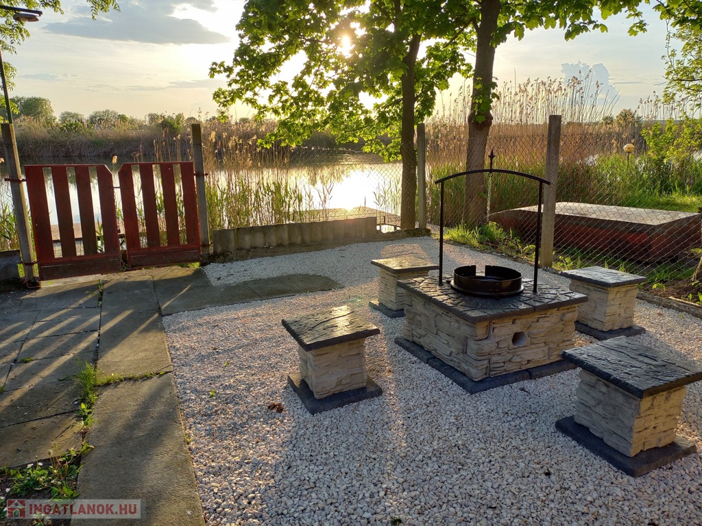 Az épülethez a víz felőli részen egy fedett terasz tartozik, előtte szépen kialakított szalonnasütő és bográcsozó. Az udvar felőli részen két külön tárolóhelyiség található.