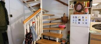 A földszinten amerikai konyhás nappali, fürdőszoba, tároló, lépcsőház, fatüzeléses