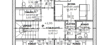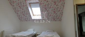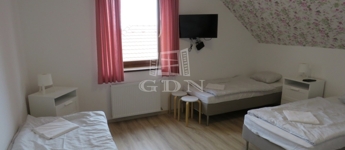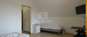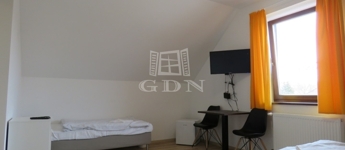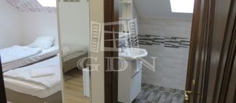 A kétszintes épület emeleten négy (2db 4 ágyas és 2db 3 ágyas), önálló fürdőszobás apartman, illetve egy teakonyha került kialakításra.