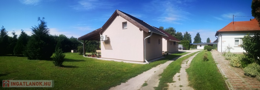 Zala vármegye, Kerkabarabás, közel 1 hektáron bejáratott magánszálláshely eladó. A szlovén határ közelében található Kerkabarabás nevét a mellette elhaladó Kerka patakról és a török eredetű "barabás" szóból kapta, melynek jelentése "vízimalom". A település a Göcsej jellegzetes dombos vidékén fekszik, melyet erdők és rétek tarkítanak. A csendes, nyugodt környezet ideális pihenésre, kikapcsolódásra. A környék számos túrázási és kerékpározási lehetőséget kínál, és felfedezhetők a Göcsejre jellemző népi építészeti emlékek is. A 9926m2-es, körbekerített telken 5 épület, valamint parkosított, 10db lakókocsi beállóval is rendelkező (vízzel, árammal rendelkező) terület található. A tégla építésű, 100m2-es, 2019-ben felújított (vezetékek, burkolatok cseréje, szigetelés, korszerűsítés, stb), szigetelt, teraszos főépületben 2 hálószoba, nappali, két fürdőszoba, konyha, előtér, kazánház és szauna került kialakításra. Az épület melegéről központi fűtés (gázkazán) és cserépkályha gondoskodik. A közel 200m2-es udvari épületben apartman (2 szobával, nappalival, konyhával és fürdővel), 24 férőhelyes (jelenleg raktárként szolgáló) „rendezvényterem”, garázs, és 2db vizesblokk található. Az épület mellett helyezkedik el a felújítandó, 2mX8mX13,5m-es, gépészettel, fúrt kúttal rendelkező fedett medence. A szállást két, 3 éve épült apartman teszi teljessé, melyek közül a szinteltolásos, szigetelt, teraszos épületben nappali, konyha, étkező, fürdőszoba és hálószoba, míg a mellette található galériás apartmanban nappali, konyha, étkező, fürdő, és háló került kialakításra. Ezen apartmanok melegéről hűtő-fűtő klíma gondoskodik. Az összességében 24 férőhelyes, tehermentes szálláshely udvarán a gépjárművek parkolása megoldott.