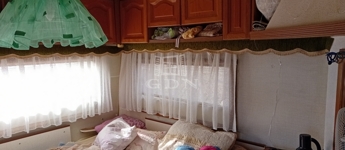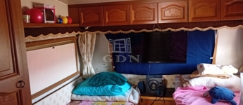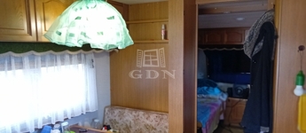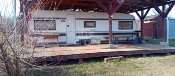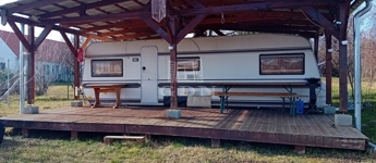 - 50 m²-es fatetőszerkezet, lemeztetővel, alatta 20 m²-es lakókocsi (5 férőhelyes) hangulatos fabútorokkal, kis konyhával