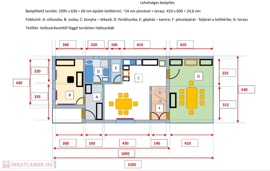 A telek beépítésére 2 szintes építmény tervezett. Ez alapján az épület (70 m2), terasz (20 m2) alapja, valamint egy 10 m2 területű pince már megépült.