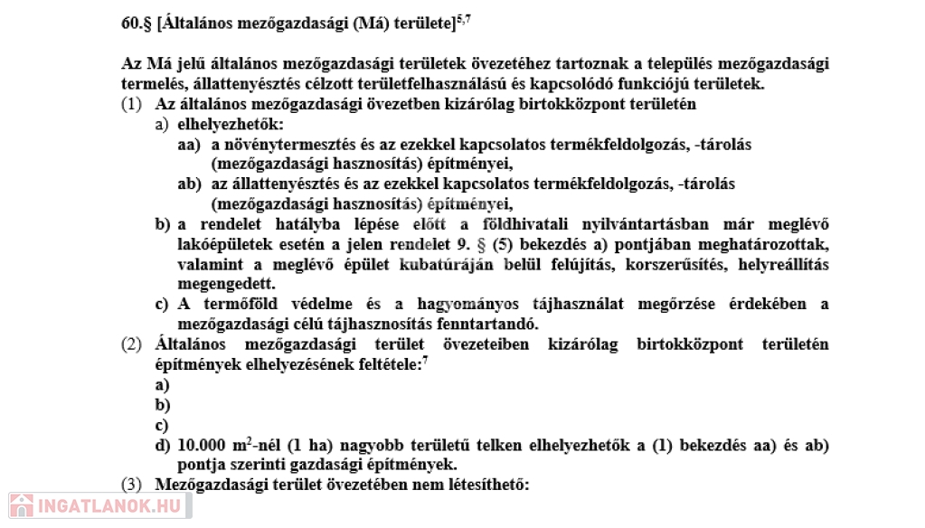Má jelű övezetben lakó funkció kizárólag birtokközpont területén helyezhető el. A lakó rendeltetés a mezőgazdasági célú gazdasági építmény építésével egyidejűleg, legfeljebb a telek beépítettségének 20%-os igénybevételével létesíthető úgy, hogy a lakó rendeltetés szintterülete a mezőgazdasági rendeltetés beépített területét nem haladhatja meg.