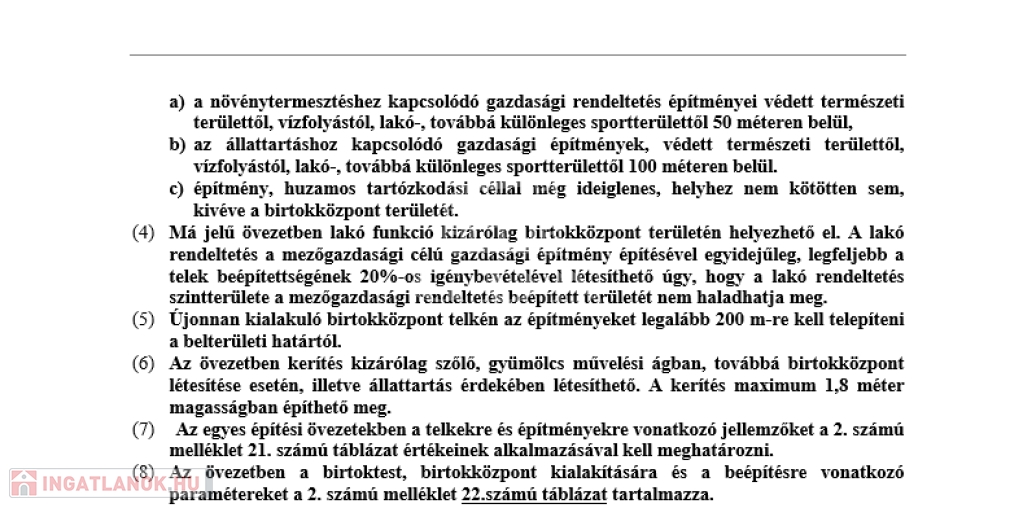 Újonnan kialakuló birtokközpont telkén az építményeket legalább 200 m-re kell telepíteni a belterületi határtól.