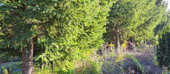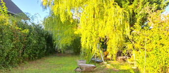 Rengeteg örökzöld, fűzfa, gyümölcsfa. A faház mögött egy művelt magaságyás lett kialakítva. Igazi "MESEKERT"!
